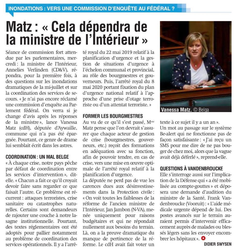Ce mercredi 1er septembre, en commission de l’Intérieur de la Chambre que la Ministre de l’Intérieur viendra répondre pour ses compétences ( services de secours et de sécurité ) sur les nombreuses interrogations que nous avons au sujet des inondations dramatiques qui ont frappé notre région.
