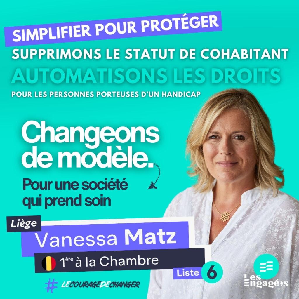 - Individualiser l’octroi des allocations, car le statut de cohabitant pénalise les familles qui accueillent sous leur toit une personne en situation de handicap ou de dépendance. Ce sera l’un de nos combats, car le droit social ne peut peser sur les choix de vie des citoyennes et citoyens ni les inciter pour des raisons financières à vivre dans la solitude.